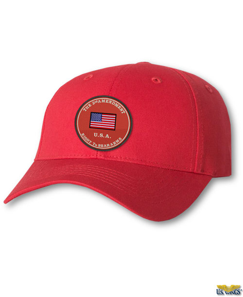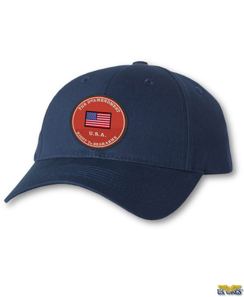 The caps are available in two versions: our 2nd Amendment Cap, and our 2nd Amendment Flag Cap, The 2nd Amendment cap features crossed rifles and a pistol. The 2nd Amendment Flag cap features the American Flag. Available in Red or Navy Blue