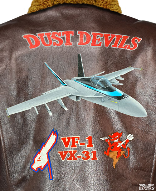 The jacket features a vintage-style fur collar, a bi-swing back for freedom of movement, two front cargo pockets, inside pocket, USN perforation through the windflap, and a silky satin nylon lining. We then upgrade it to “Top Gun” status by adding authentic patches as seen in the upcoming Top Gun: Maverick movie (the Air Test and Evaluation Squadron VX-31 “Dust Devils” patch on the right chest, a embossed leather Top Gun nameplate on the left chest, the USN Fighter Weapons School patch on the right sleeve, and the US Flag on the left sleeve). The back of the jacket features our “Dust Devils” artwork, custom handpainted by our resident jacket artist Jim Harley.