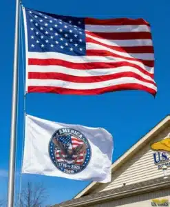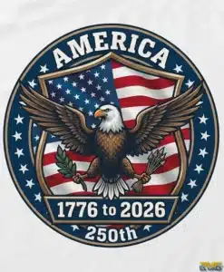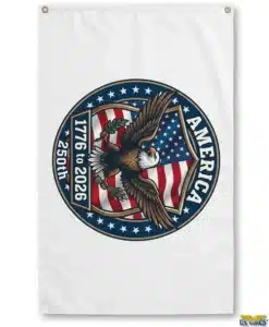 Our 250th Anniversary Flag is made from heavy-duty nylon and is a durable, weather-resistant banner designed to commemorate the United States’ 250th anniversary. The fabric is thick yet lightweight enough to fly in the wind, with reinforced stitching along the edges and brass grommets for secure mounting. Its vibrant colors and commemorative design are fade-resistant, making it suitable for both outdoor display and long-term use. Size: 3′ x 5′. A US Wings exclusive.