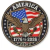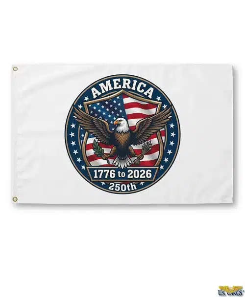 Our 250th Anniversary Flag is made from heavy-duty nylon and is a durable, weather-resistant banner designed to commemorate the United States’ 250th anniversary. The fabric is thick yet lightweight enough to fly in the wind, with reinforced stitching along the edges and brass grommets for secure mounting. Its vibrant colors and commemorative design are fade-resistant, making it suitable for both outdoor display and long-term use. Size: 3′ x 5′. A US Wings exclusive.