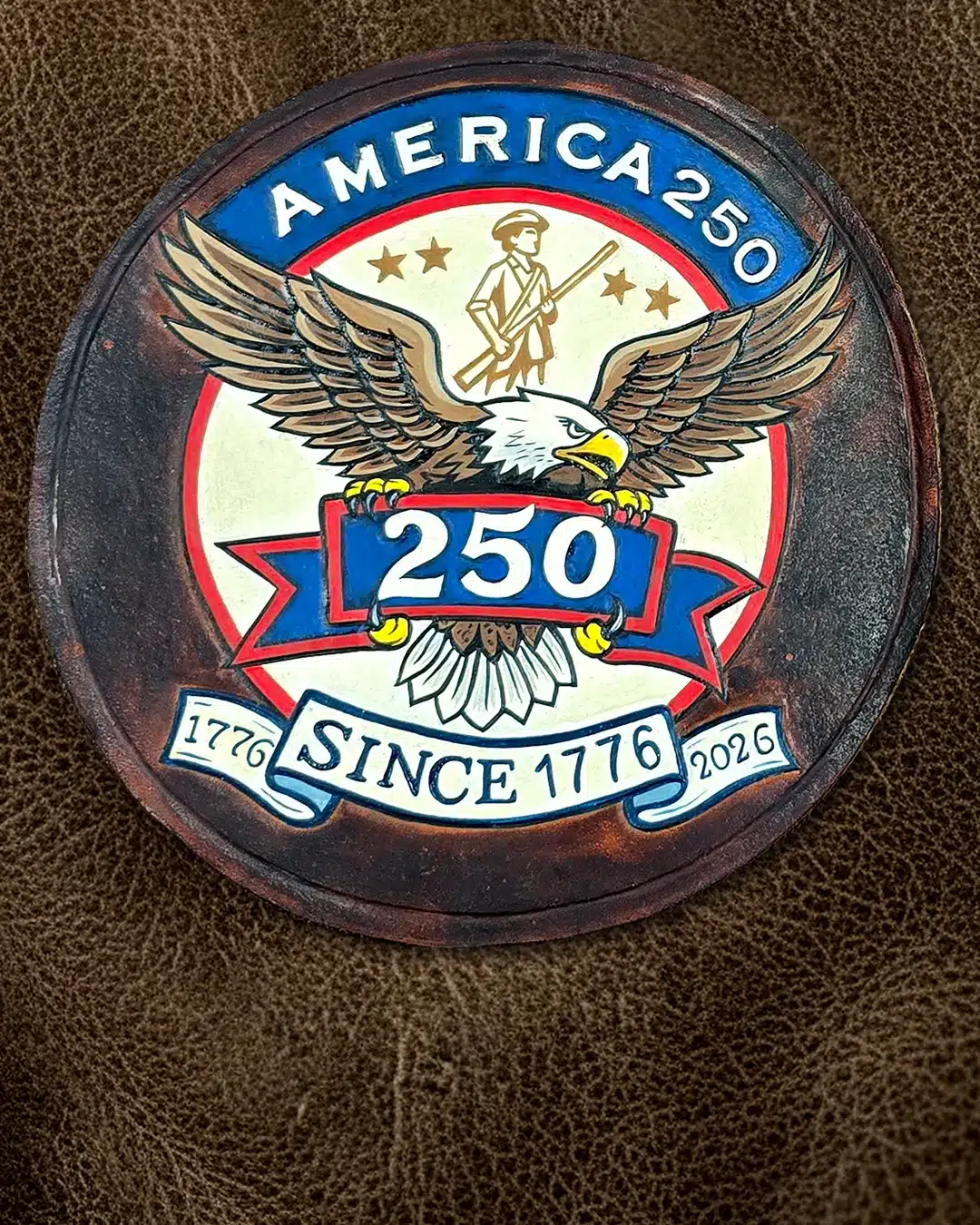 The 250th Anniversary Hand Painted Leather Patch features: