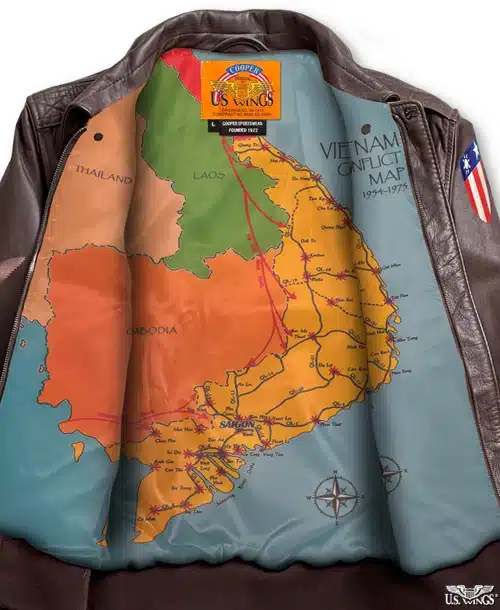 You can now pay tribute to the legendary AVG with our Flying Tigers AVG 50 Mission™ Goatskin A-2. This jacket is patterned after the WWII A-2 jacket and features two front cargo pockets with WWII-style pocket flaps (and no side-entry handwarmer pockets, just like the WWII version), a snap-down collar, throat hook, a one-piece back, and your choice of a plain poly cotton lining or our exclusive Vietnam map lining.