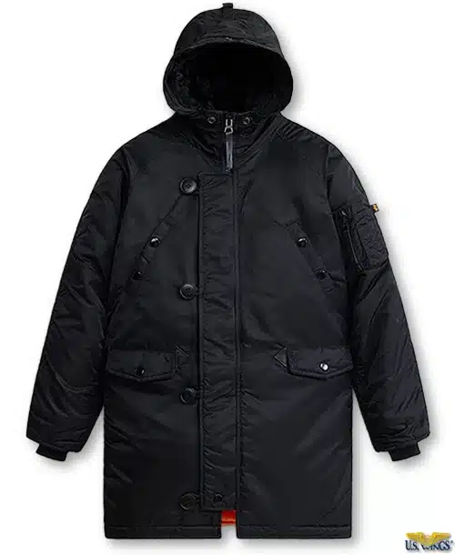 N-3B jackets were first produced, in the mid 1950s, for USAF air crews. The crews transported troops in extremely cold climates. Originally made with a nylon outer shell and a wool interlining. Manufacturers changed the interlining to polyester batting. The long, sage green jackets became known as the “Snorkel” parka. Today’s N-3B parkas have slant pockets at the chest, flap pockets lower on the coat, and a panel that fastens with loops across the zipper.