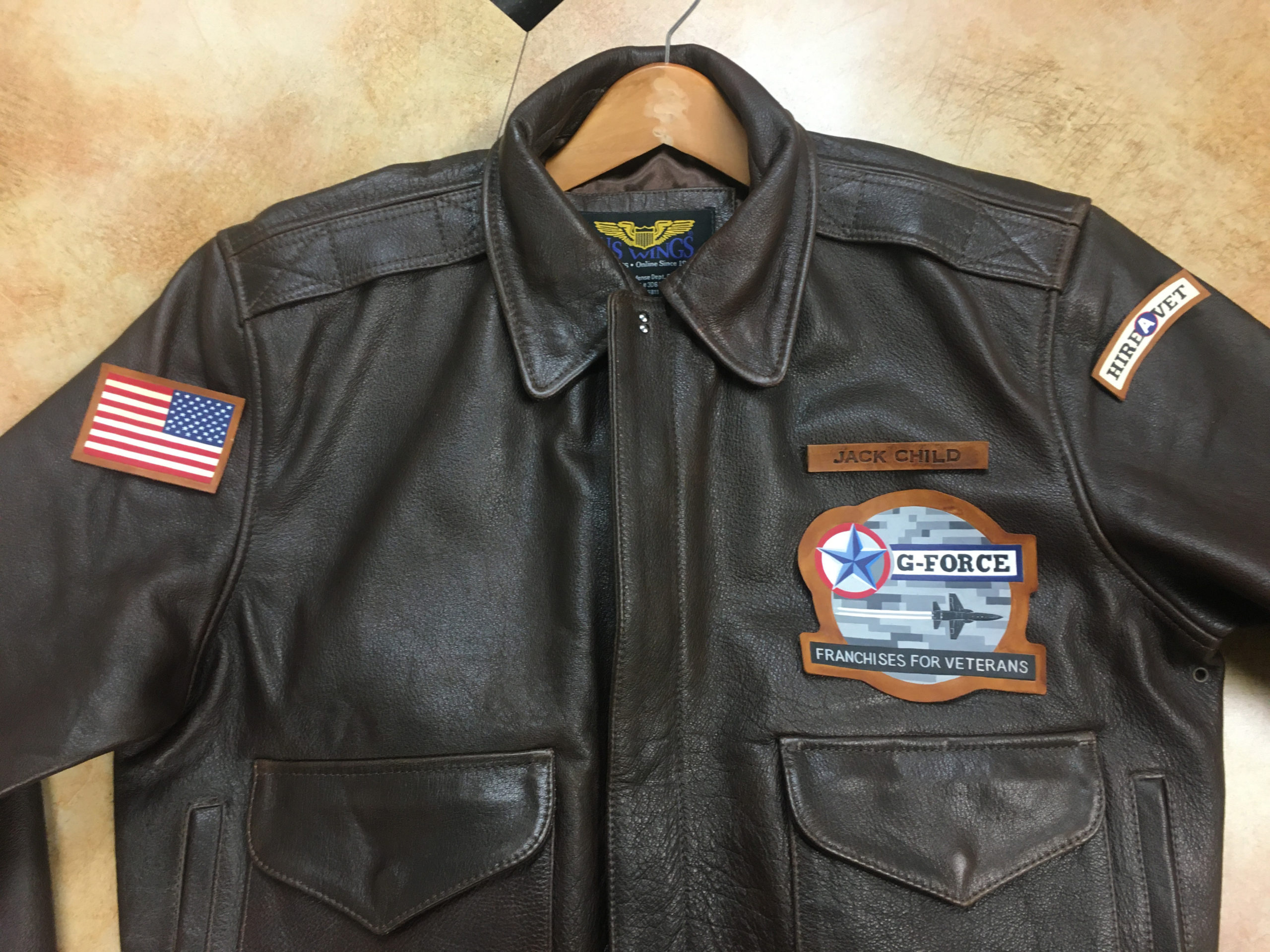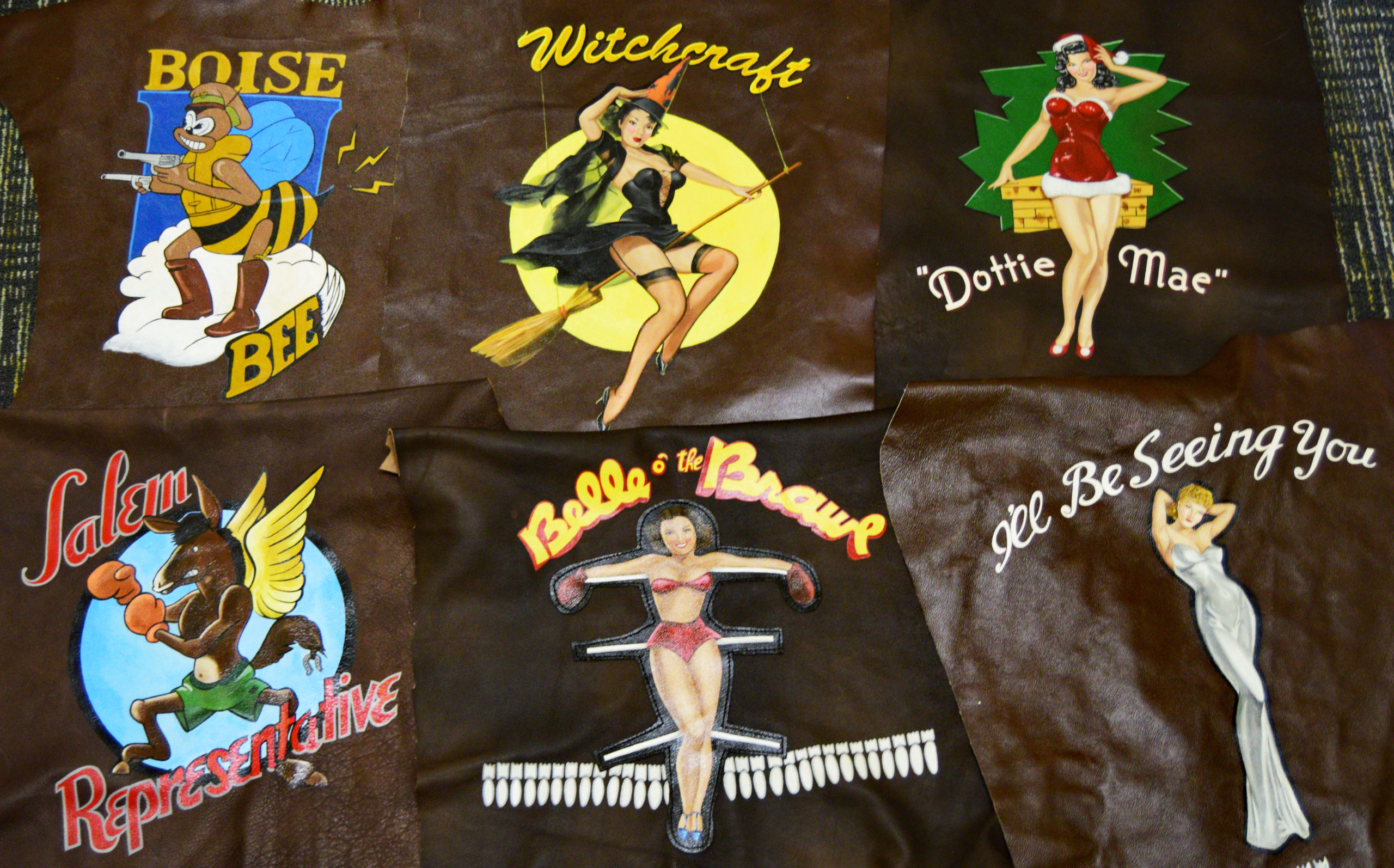 Custom handpainted jackets & patches are a collector’s item and a great way to show off WWII nose art, a unit insignia, a company logo, or any other design you specify. Customers can select a jacket from US Wings or send us one of your own for painting. Recent examples above show custom leather patches. For more information and to see samples of Jim Harley’s work, please visit our Handpainted Nose Art Jackets page or our Handpainted Leather Patches page or call Bob Kruty at 1-800-650-0659.